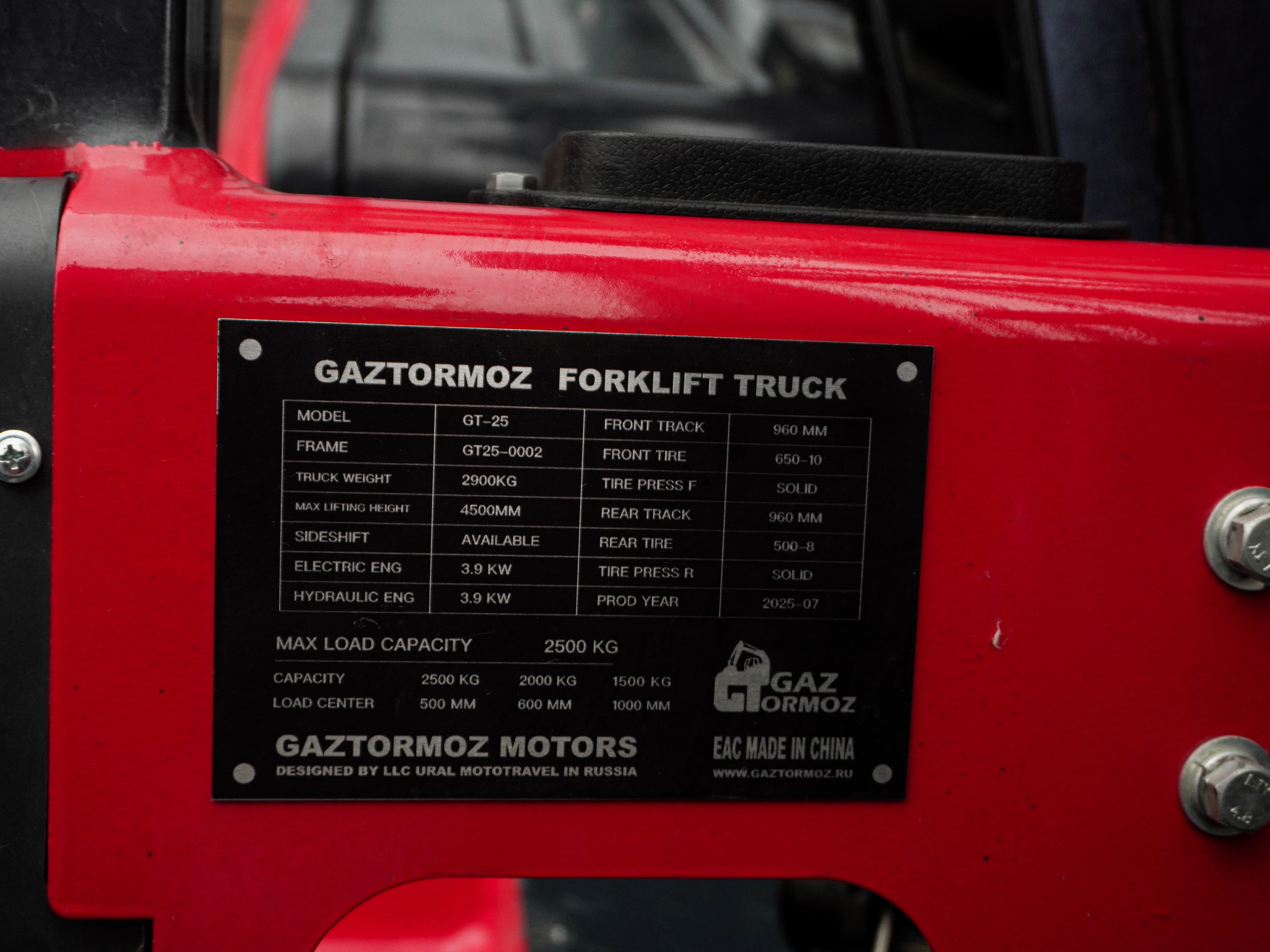 - Грузоподъёмность: 2500 кг при центре нагрузки 500 мм.